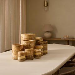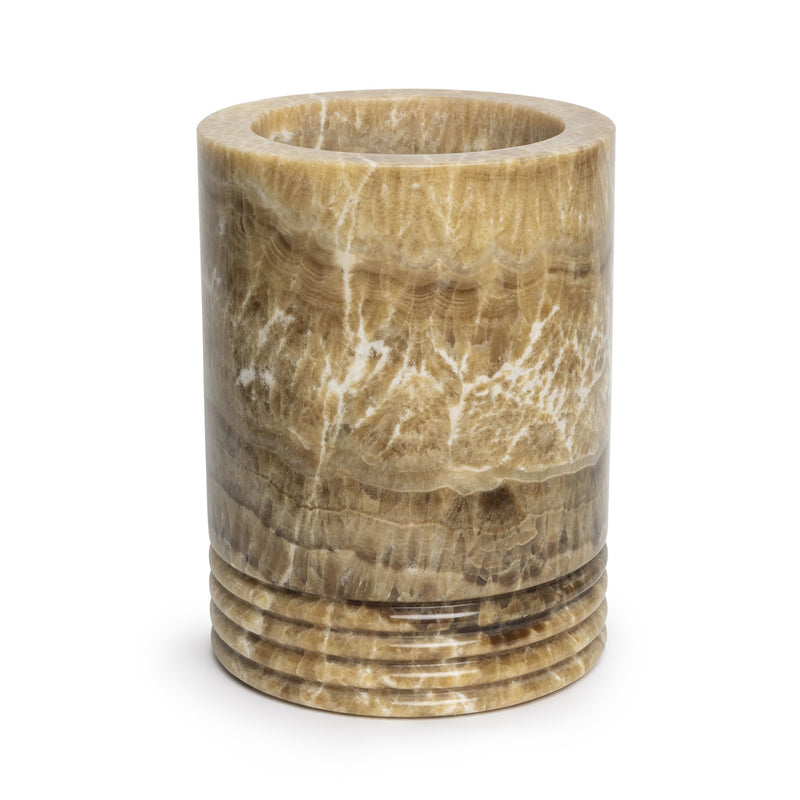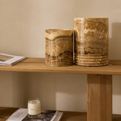 These lanterns are made of real onyx, a unique stone with warm brown and beige tones. No two lanterns are alike; the natural lines and colors of the stone make each piece unique.